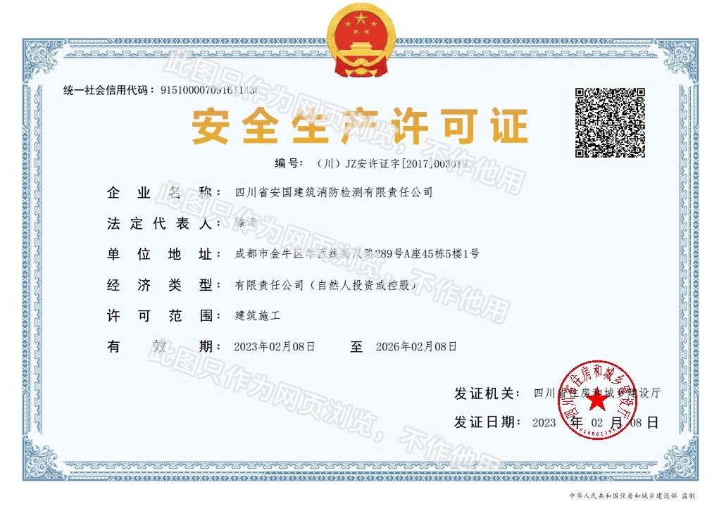 四川省安國建筑消防檢測有限責任公司 地址:成都市武陽大道一段288號中央花園城市別墅一期1棟28號